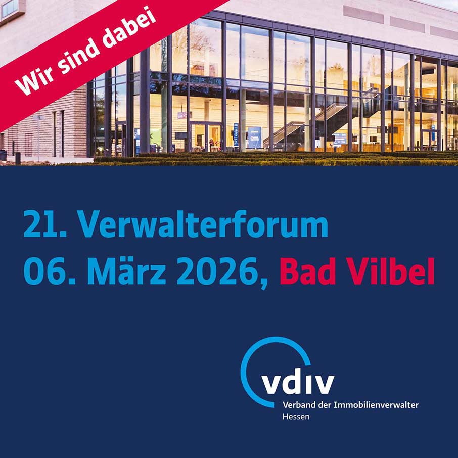 Am 06. März 2026 sind wir beim 21. Verwalterforum in Bad Vilbel vertreten. Die Veranstaltung bietet eine zentrale Plattform für den fachlichen Austausch rund um aktuelle Themen, Entwicklungen und Herausforderungen in der Immobilienverwaltung.